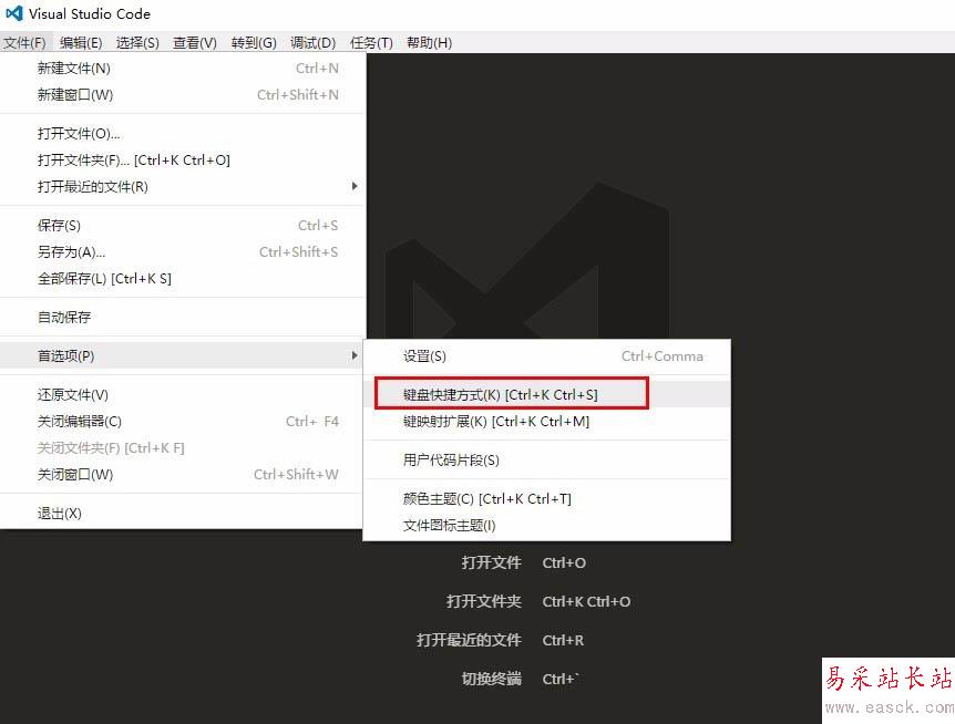 1、首先打開vscode編輯器,點擊首頁——首選項——鍵盤快捷方式;