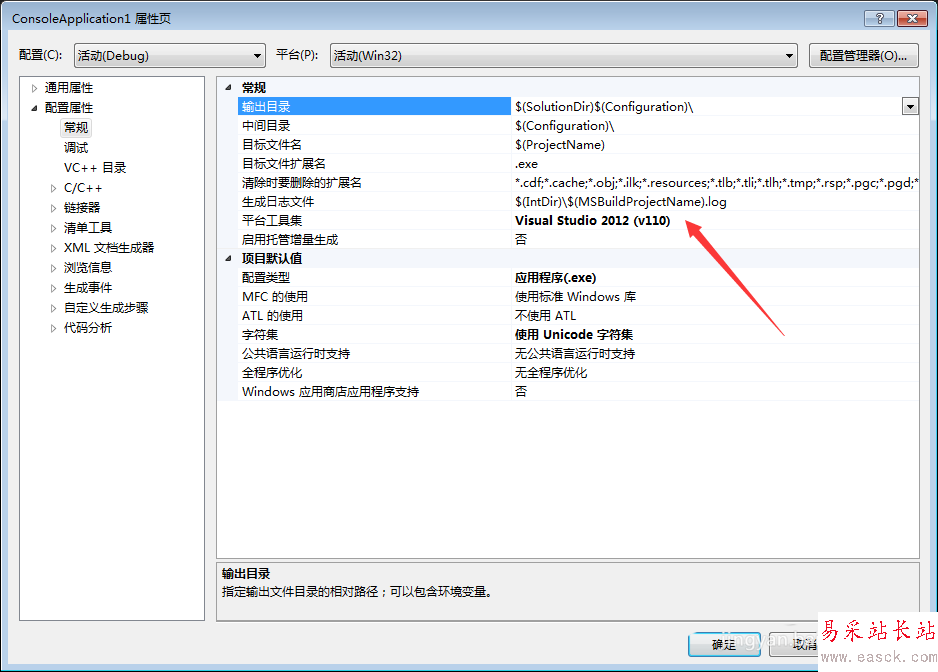 5、找到平臺工具集,會發現后邊就是Visual Studio的版本,需要升級的時候會有一個下拉三角形,點擊三角形選擇對應的版本,然后點擊確定即可。