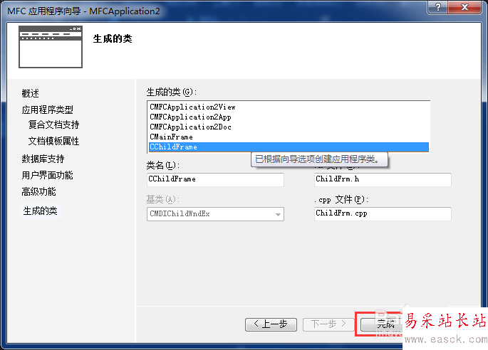 11、最后,系統就會根據配置,生成代碼,對應代碼的類結構如圖。點擊“完成”一個MFC的程序就完成了。