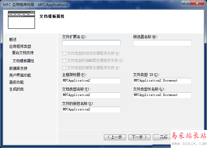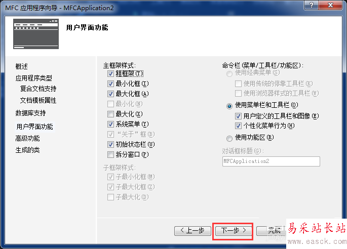 5、這個界面一般主要就是選擇應用程序類型,多文檔的是最全的,設計相對也復雜點。對話框的話,結構有些功能是用不了的。之前就吃過虧,對話框的有些功能怎么也使用不了。