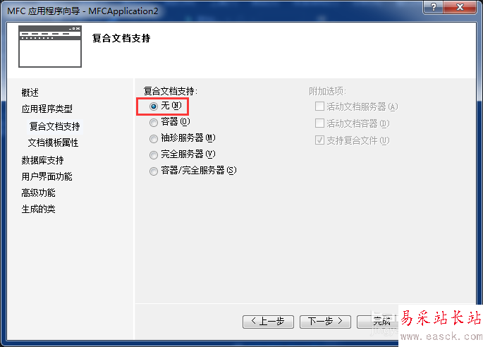 6、復合文檔。主要就是是否需要容器和服務器,一般程序不需要,選擇“無”,點擊下一步