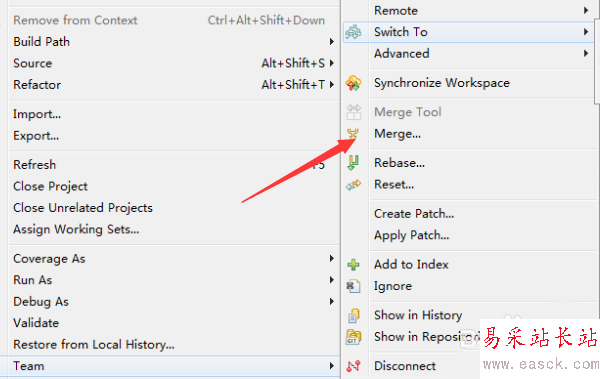 2、然后進(jìn)行選中需要合并分支代碼項(xiàng)目進(jìn)行右鍵后,彈出了下拉菜單中進(jìn)行選擇為team的選項(xiàng)。