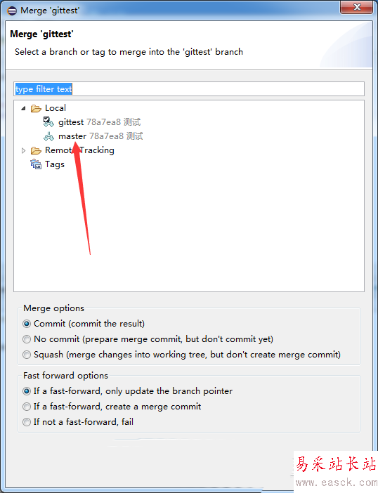 4、就會(huì)彈出了一個(gè)合并分支窗口的界面中,進(jìn)行選擇為需要合并分支上。