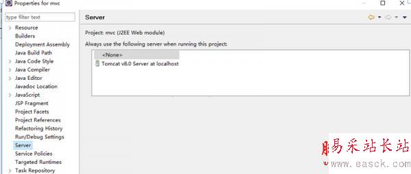 (2)在項(xiàng)目上右鍵Properties 選擇Server 發(fā)現(xiàn)當(dāng)前選擇的服務(wù)器為<None>,選擇下面的Tomcat v8.0 Server at localhost