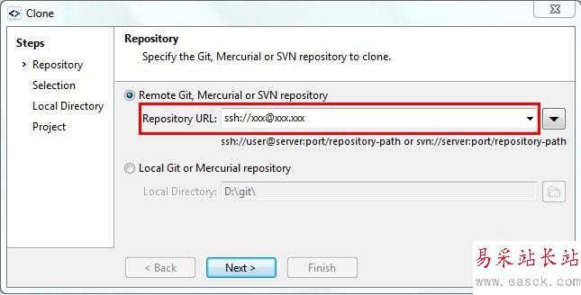 2、然后彈出對(duì)話(huà)框,先填寫(xiě)Repository URL。然后Next。