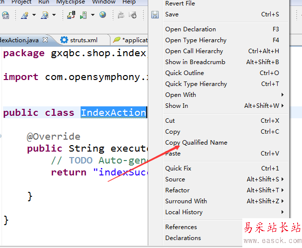 1、如果你是在類外部點擊右鍵,然后選擇Copy Qualified name,它的結果是帶有斜線的路徑。例如:/shop1/src/gxqbc/shop/index/IndexAction.java