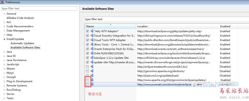 2、window-preference打開eclipse的設(shè)置。在updates-vailable software sites中,把無效的地址取消勾選