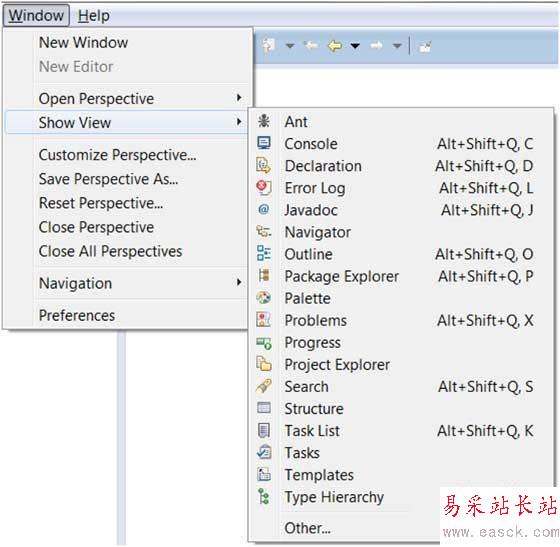 1、你可以在 Window 菜單中點擊 "Show View" 選項打開其他視圖,如下圖所示: