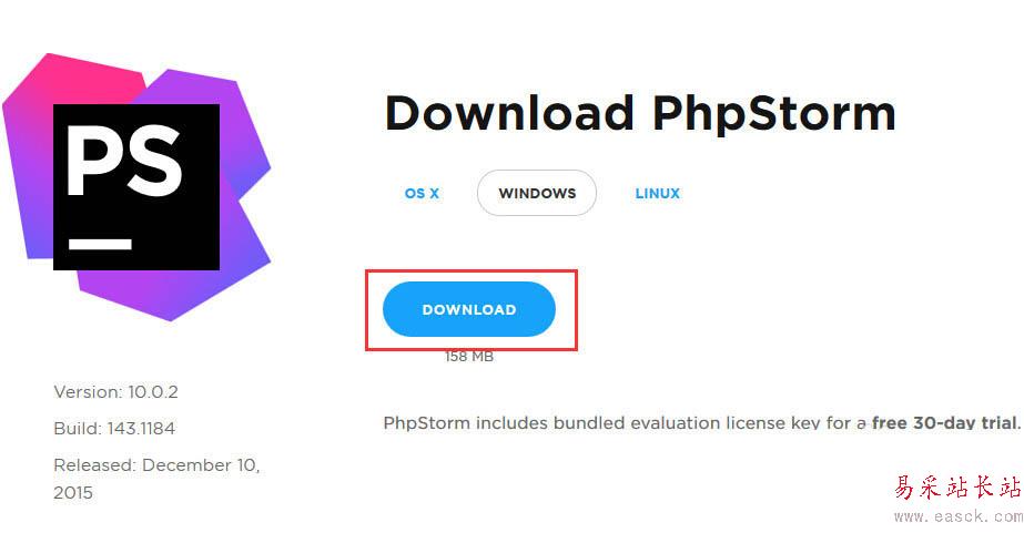 3、進入“PhpStorm”官網后,點擊“DOWNLOAD”按鈕,進入下載頁面,如下圖所示。