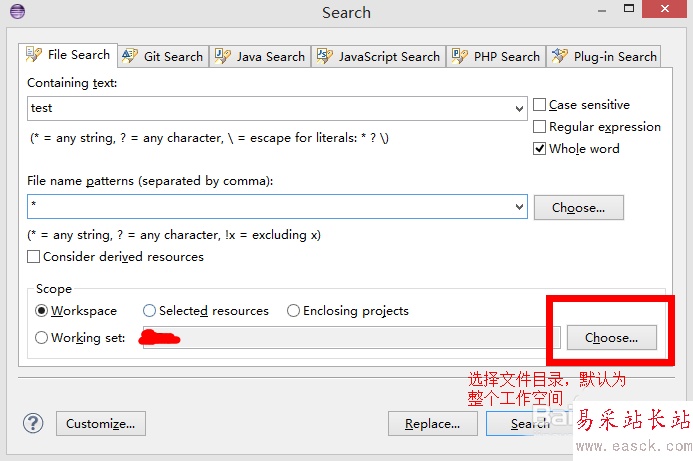 5、選擇文件的范圍,默認為整個工作空間,可以點擊右邊的choose自定義,在彈出的窗口中點擊New...;