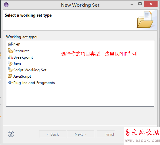6、選擇你的項目類型(因為我工作空間已經有幾個PHP項目,這里以PHP為例),雙擊PHP文件夾,你的項目會全部列出來,選擇好項目之后,在上面的輸入框內隨便輸入一個名稱,點擊Finish,最后點擊Search搜索即可。