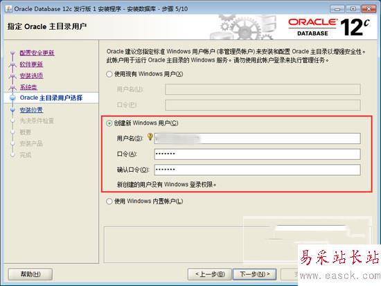 7、這項功能是專門管理oracle文件的,選擇第二個”創建新windows用戶“,輸入用戶名和口令,單擊”下一步“