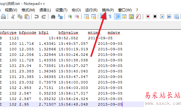 3、在notepad++的首頁上找到插件菜單,并點擊打開插件設(shè)置的下拉菜單。