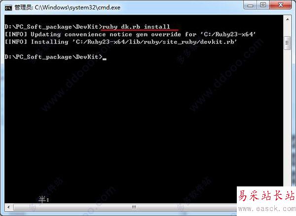 5.接下來在DevKit的安裝目錄中,輸入“ruby dk.rb install”,如下圖所示。