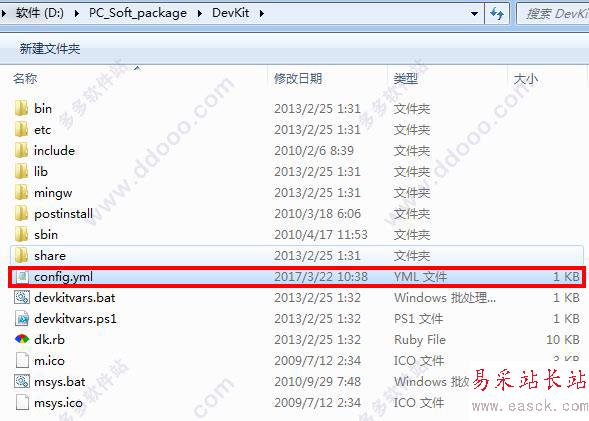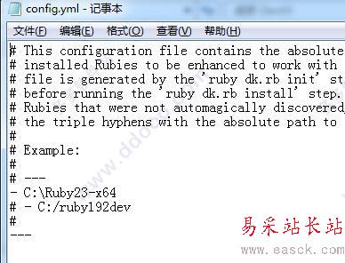 4.接下來運行下載的解壓文件中的“DevKit-mingw64-64-4.7.2-20130224-1432-sfx.exe”,安裝DevKit,小編將它安裝在了“D:/PC_Soft_package/DevKit”文件中,之后在cmd中進入DevKit的安裝目錄,執行ruby dk.rb init命令。最后修改config.yml文件(該文件位于DevKit安裝目錄中),將文件中的 C:/Ruby22-x64 修改為你的Ruby安裝目錄,如下2圖所示。