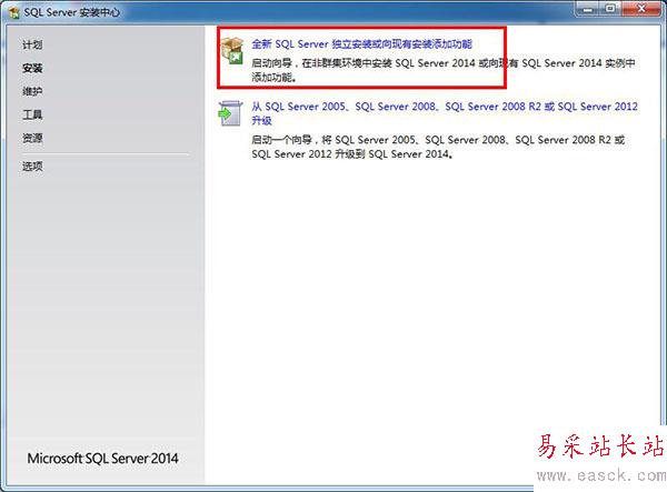 4、準備安裝,選擇第一個“全新SQL Server獨立安裝或向現有安裝添加功能”