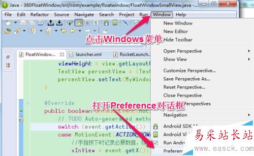 1、首先,是設(shè)置背景色的方式,打開Eclipse以后,依次點(diǎn)擊 Windows -> Preference。打開界面配置對(duì)話框。操作如圖所示
