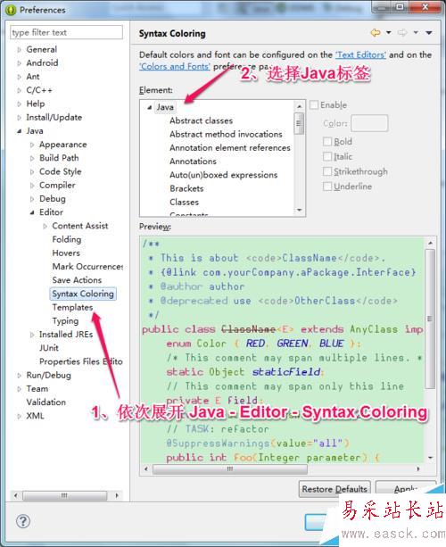 1)展開Java標(biāo)簽 ,展開 Editor標(biāo)簽,點(diǎn)擊Syntax Coloring 標(biāo)簽,右側(cè)彈出選項(xiàng)卡。