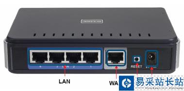 B. 將一條以太網纜線的一端插入DI-504后面板上的WAN端口,另一端插入您的DSL/Cable modem上的以太網端口。DI-504前面板的WAN口的LED指示燈亮,表明操作正確。