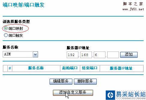 2)此頁面默認已選擇了”端口映射”,在“服務名稱”中列出了一些常用的服務,但下面我們以建立一個此列表中沒有的服務為例。點擊頁面下方的”添加自定義服務”:
