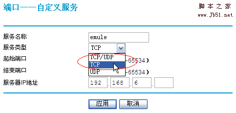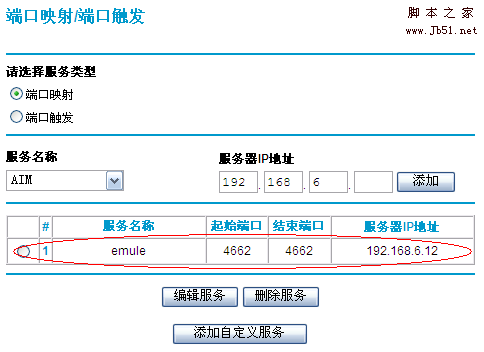 3)以eMule為例。當在局域網中使用eMule時,通常只能獲得LowID,通過端口映射后即可獲得HighID了。在”服務名稱”中添加您為此服務的命名,此處我們將其命名為eMule,”服務類型”選擇TCP(或者TCP/UDP):