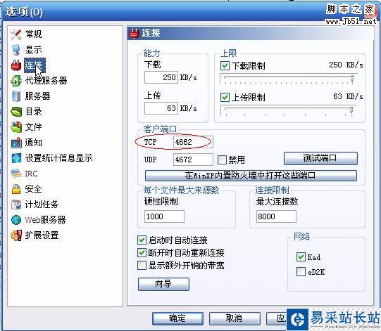 4)“起始端口”和”結束端口”都設置為eMule所使用的端口,如在eMule-0.46c-VeryCD0913中,默認使用的TCP端口是4662,此參數是在eMule的選項->連接->客戶端口中定義的: