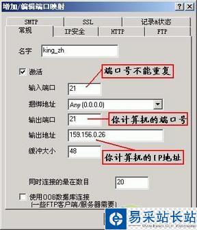 3、輸出端口:這里填寫的是你計算機中的FTP服務端口,通常采用默認的“21”,除非你另行指定了特殊的端口。