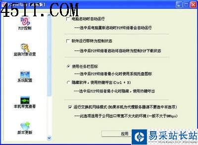 3.點擊“系統配置”按鈕,切換到如圖3所示的界面,如果是ADSL上網模式,那么請選中界面底部的“運行交換機網絡模式”,如果是代理服務器模式,那么一定不要選中本選項,否則控制無效。另外,你還可根據自己的需要設置“軟件運行即轉為控制狀態”、“電腦啟動時自動運行”、“快捷呼出鍵”等選項。最后點擊“應用”保存配置。