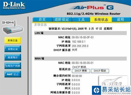 7、 之后會回到無線路由器的「首頁」設定界面,接著點選右上方「系統狀態」選項,在「系統信息」-「WAN 端」項目,查看IP 地址、子網掩碼、默認網關、DNS 是否有數字,若無顯示任何數字(如下圖),表示并沒有成功取得IP 地址,請點選「DHCP更新」。
