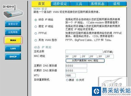 5、 進入「WAN」界面后,點選「動態IP 地址」,其它字段請勿輸入或任意更改,最后點選「執行」按鈕。