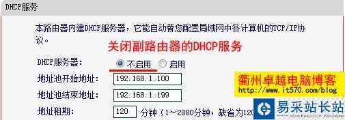 副路由器:DHCP服務 選擇關閉,一個網絡中最好只有一個DHCP服務器。 |