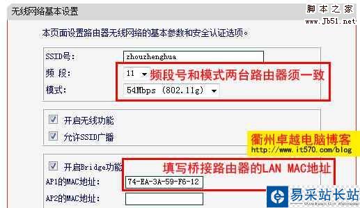 路由器管理界面——無線參數——基本設置 勾選“開啟Bridge功能” 在AP1的MAC地址中輸入之前記錄的對方LAN口MAC地址(兩臺路由器同樣操作)。在頻段和模式選項中兩臺路由器須一致否則無法連接。 |