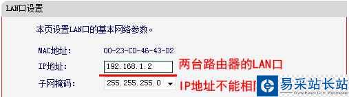 登錄副路由器(沒有連接互聯網的路由器) 網絡參數——LAN口設置 在IP地址中輸入不與主路由器相同的IP地址。 |