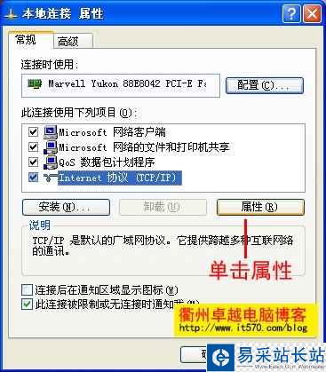 選擇“Internet 協(xié)議(TCP/IP)”——“屬性” 。