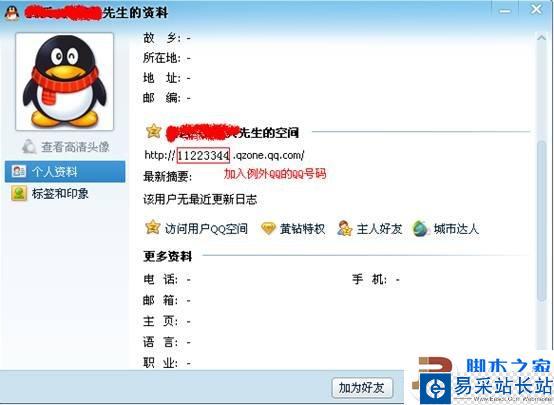 點擊查看個人資料,查看QQ空間的地址,在QQ空間的地址中,包含了一個QQ號碼,該QQ號碼就是需要添加到例外QQ的QQ號碼。(注意:每個工號都對應了一個QQ號碼,需要將這些號碼都查找出來)