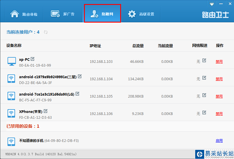 打開路由衛士,點擊防蹭網。可以清楚的看到路由器的連接情況,哪些是您的小伙伴,哪些是不請自來的不速之客一目了然。動動鼠標,趕緊將這些不速之客請出您的網絡吧。