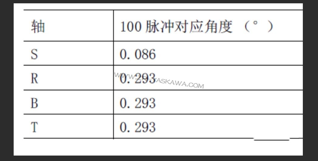 YASKAWA機器人維修報警代碼-4511:這一報警會在伺服接通時觸發,具體原因是上次伺服關閉與本次伺服接通之間,機器人的位置脈沖差值超過了100。當遇到這種報警時,用戶只需點擊示教器頁面上的【重置】,報警后重新接通伺服電源即可解決。為了更直觀地理解這一數值,以下表格列出了MOTOMINI各軸在100脈沖時所對應的角度,僅供參考。
