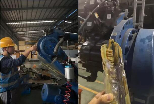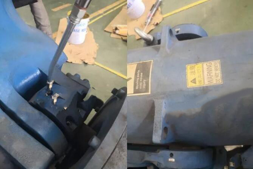 將機(jī)器人手動(dòng)調(diào)整到合適角度,拆開各軸進(jìn)出油嘴堵頭;