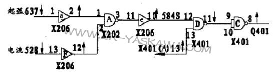 停弧控制如圖8所示。按停弧按鈕S6后,RS觸發(fā)器X207(A、B)翻轉(zhuǎn),X207(B)5↓→Q208截止,焊機(jī)焊接狀態(tài)停止,由于X207(B)5↓→X207(B)6↑→X202(C)10↑、X202(C)9↓→X202(C)8↓→X205(C)6↑,584C、X401(D)13↑→X401(D)11↓→X401(C)8↑→Q401導(dǎo)通,焊機(jī)進(jìn)入給定熄弧規(guī)范狀態(tài)。經(jīng)PUT(QU401)回路延時(shí)后,583C↑→X206(b)4↓一587↓焊絲反抽。