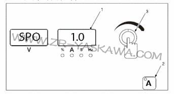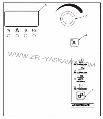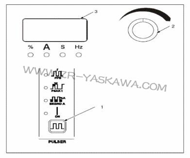 1A電流控制按鈕2編碼控制鈕3電流表注:當脈沖功能起作用時,按下電流控制按鈕,轉動編碼器,以設定焊接電流或峰值電流。