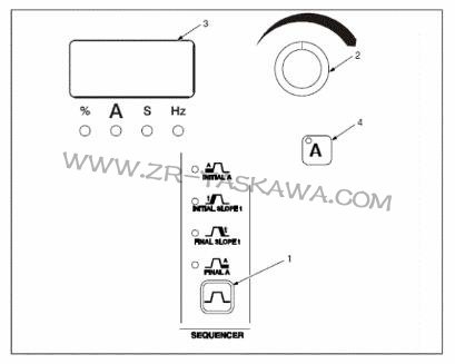 選擇TIG工藝時有工序控制功能,但在標準遠控模式下,腳控或手控電流遠程控制器與遠程插座連接后,此功能不起作用。按下按鈕直到期望參數的LED燈亮。