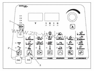 第三,按下工藝按鈕,直到選擇的工藝一高頻脈沖TIG、提升啟弧TIG、或手弧的LED燈亮。第四,改變或設置所有的參數。