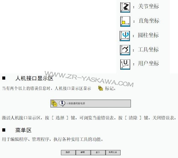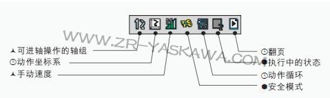顯示狀態(tài)區(qū)顯示控制柜的狀態(tài),顯示的信息根據(jù)控制柜的模式不同 (再現(xiàn) / 示教)而改變。