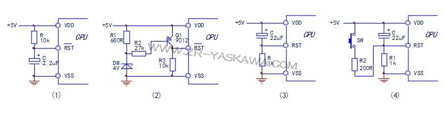 上圖(3)、(4)電路為高電平復位脈沖形成電路。(3)電路出為R、C延時電路,上電瞬間,C的充電電流使RST輸入端產生一個高電平電壓跳變,隨充電過程的進行,RST端子上電壓逐漸降低,約20μs后,RST復位信號輸入端變為OV地電平,復位過程結束;(4)電路,在(3)電路的基礎上,增加了SW、R2手動復位電路,在變頻器運行過程中,若因某種原因出現故障鎖定或“程序死機”現象時,可按動一次SW按鍵,實施人工強制復位。