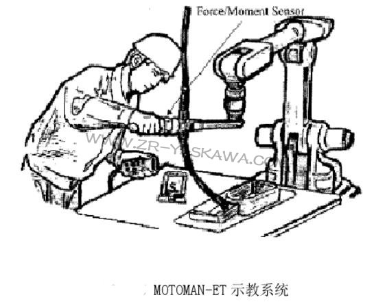 廣州武林網(wǎng)安川機器人:安川MOTOMAN-ET示教系統(tǒng)是一個典型手把手的示教示教再現(xiàn)系統(tǒng)。如圖所示,操作員通過操縱安裝在機器人末端的控制手柄對機器人進行作業(yè)軌跡演示,控制手柄上的力/力矩f專感器產(chǎn)生相應(yīng)的輸出數(shù)據(jù)用于機器人控制器驅(qū)動機器人向期望的方向運動。其不足是無法確定機器人的最優(yōu)作業(yè)姿態(tài)與路徑,而且必須加入監(jiān)測和剎車作為人身保護措施。