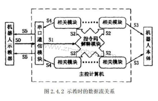 示教時,當用戶按下示教鍵盤上的按鍵時,示教器通過線纜向主控計算 機發出相應的指令代碼(S0);此時,主控計算機上的主控模塊中負責串口通信的通信子模塊中的串口監視線程接收指令代碼(S1);然后由指令碼解釋模塊分析判斷該指令碼,并進一步向相關模塊發送與指令碼相應的消息(S2);驅動有關模塊完成該指令碼要求的具體功能(S3);同時,為了讓操作用戶時刻掌握機器人的運動位置和各種狀態信息,主控計算機的有關模塊同時將狀態信息(S4)從串口發送給示教器(S5),在液晶顯示屏上顯示,從而與用戶溝通,完成數據的交換功能。在早期的示教再現系統中,還有一種人工牽引示教[2]。一般是操作員直接牽引機器人沿作業路徑運動一遍,對于難以直接牽引的大、中型功率液壓機器人,這種方式并不合適。于是又有人工模擬牽引示教,在牽引的過程中,由計算機對機器人各關節運動數據采樣記錄,得到作業路徑數據。由于這些數據是各關節的數據,因此這種方法又被稱為關節坐標示教法。這種示教方法的優點是控制簡單,缺點是勞動強度大,操作技巧性高,精度不易保證。