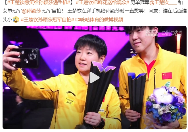 冠軍自拍!王楚欽憋笑給孫穎莎遞手機(jī)