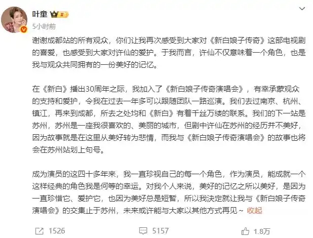 葉童將不再參與新白娘子傳奇演唱會(huì)