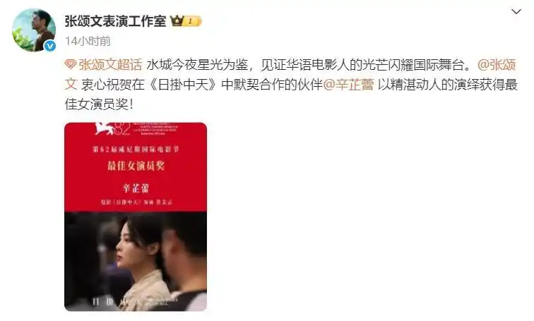 辛芷蕾獲獎(jiǎng)后發(fā)文:感恩所有