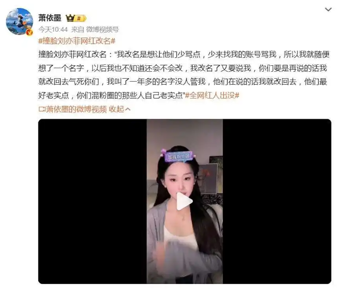 撞臉劉亦菲網紅“劉一菲”改名:想讓他們少罵點